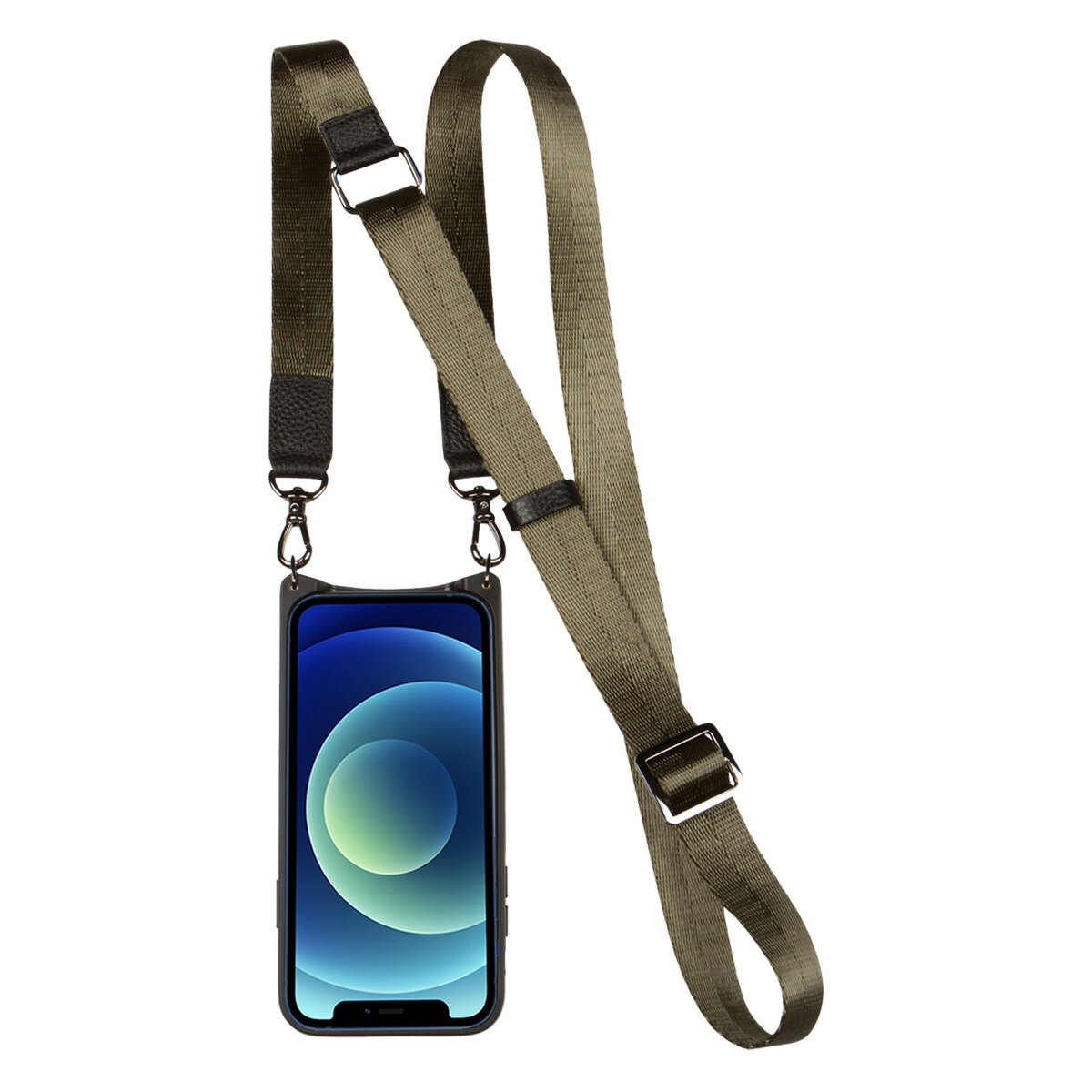 手にほどよくフィットするiPhoneケースと、肩から斜めがけが出来るストラップを合わせた革新的なデザインで、カジュアルなファッションにも合わせやすいグリーンストラップとなっています。